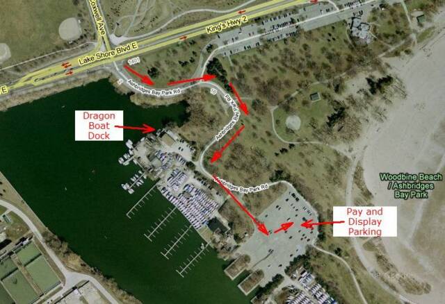 By car from the west, drive east along Lakeshore Blvd East until you get to the intersection of Coxwell Ave (which ends at Lakeshore). Coxwell turns into Ashbridges Bay Park Road south of Lake Shore Blvd East. Turn south on Ashbridges Bay Park Road and follow the winding road (keeping right) until the large parking lot (see map below). Park your car, get a "Pay & Display" ticket from the meter, then walk back along the road you came a few hundred feet to the entrance of the Lions Club/ Balmy Beach property. To the right of the vehicle entrance you will see a pedestrian gate. Walk through that gate and straight to the water behind the Lions Club building. The other buildings to the left are not part of the Balmy Beach Canoe Club. Go down to the dragon boat docks and meet the team by the picnic tables. Car-pooling will also be arranged.